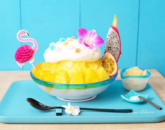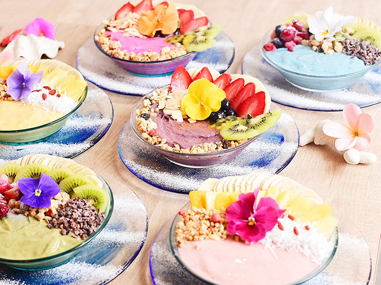 沖縄の海水を削った看板メニュー「ふわふわかき氷」のほか、「アロハフルーツボウル(アサイーボウル)」 「グリークヨーグルト」 「フィンガーサンド」 「練乳フラッペ」など、フルーツたっぷりスイーツがすべて本格自家製です。