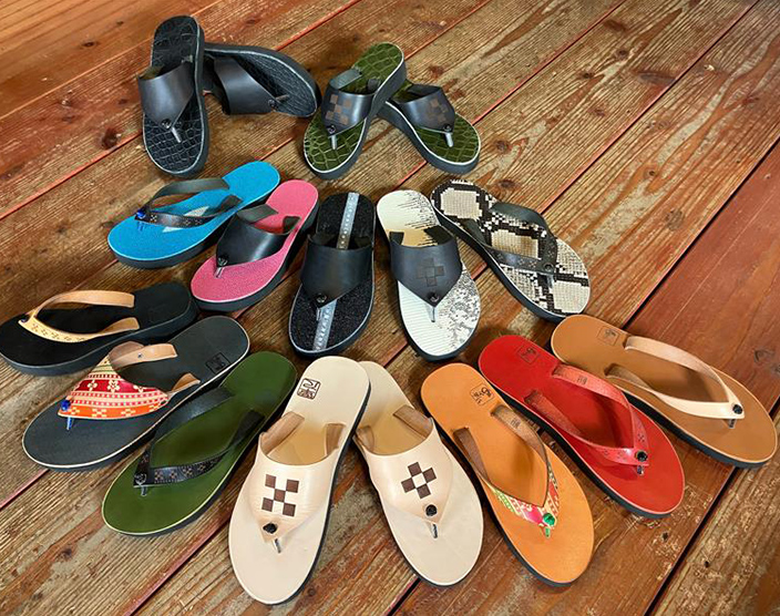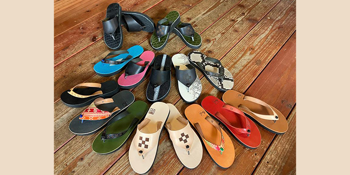 沖縄初の革ぞうり専門店。地元・本部町の『もとぶ牛』や『琉球藍染め』などの素材を使った革ぞうりは、履き心地がよく耐久性抜群です。